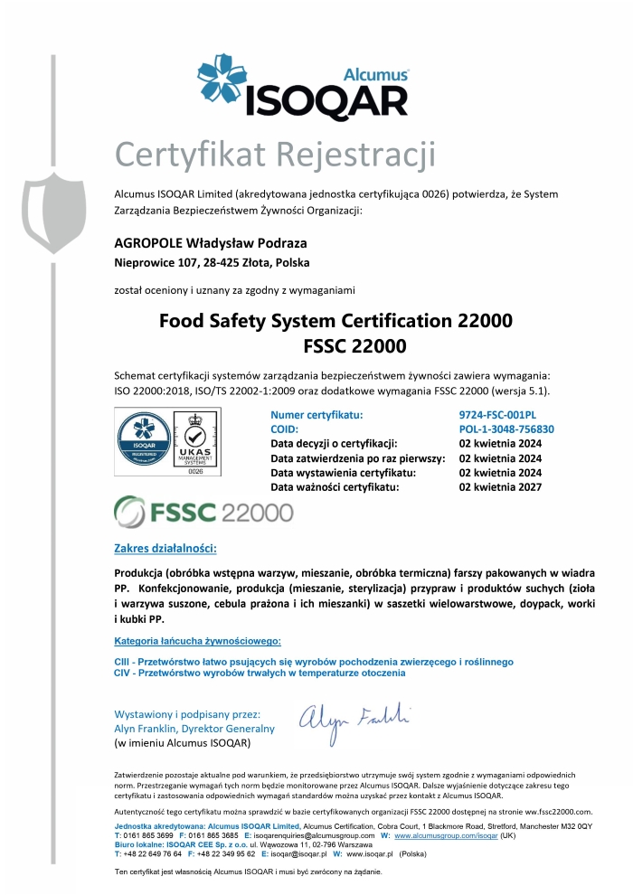 W 2012 r. w zakładzie został wdrożony System Zarządzania Bezpieczeństwem Żywności wg normy ISO 22000. Posiadany certyfikat jest gwarancją, że  kwestie związane z jakością i bezpieczeństwem żywności są traktowane przez naszą firmę priorytetowo. W 2024 r. nasz zakład przeszedł certyfikację na zgodność ze standardem FSSC 22000.